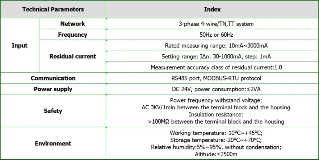 | Residual current | Rated measuring range: 10mA~3000mA | |
