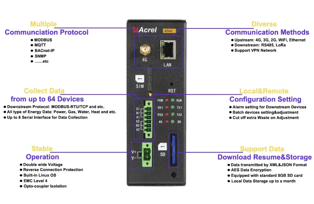 Real-time detection, upload failure to automatically save the data to be transmitted, including 8G SD Card, to support external storage media plug and play and space expansion, network recovery data to be automatically uploaded |