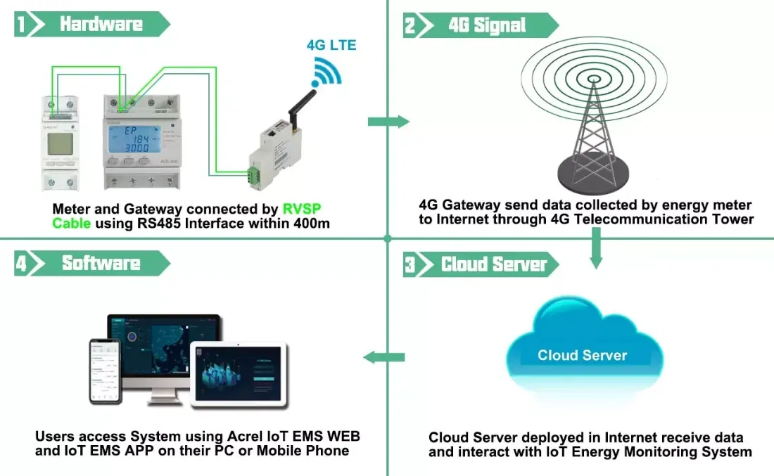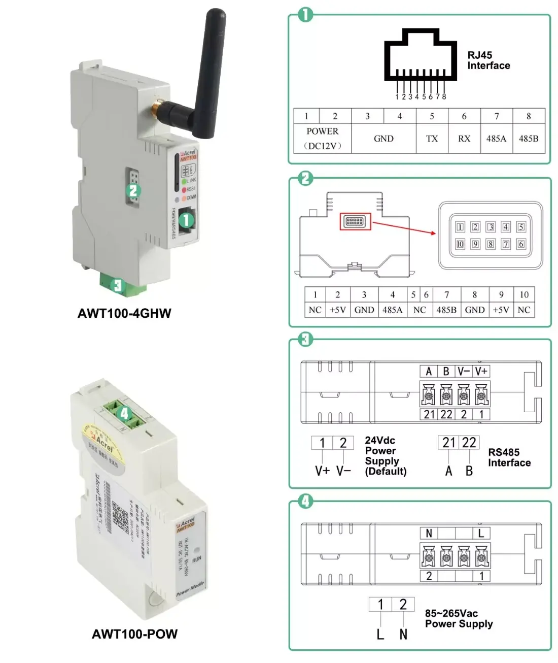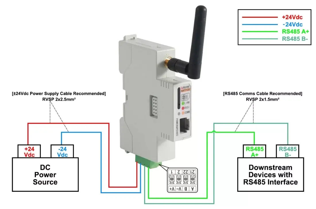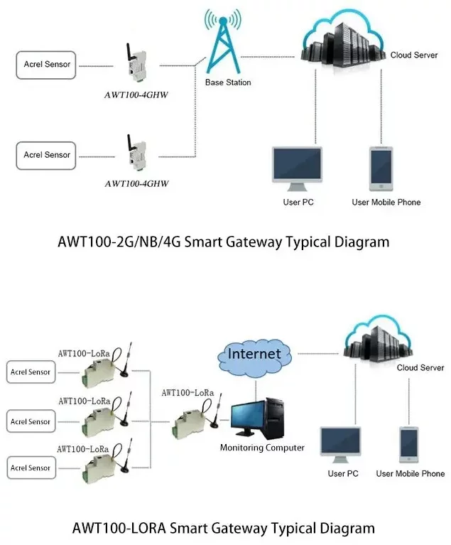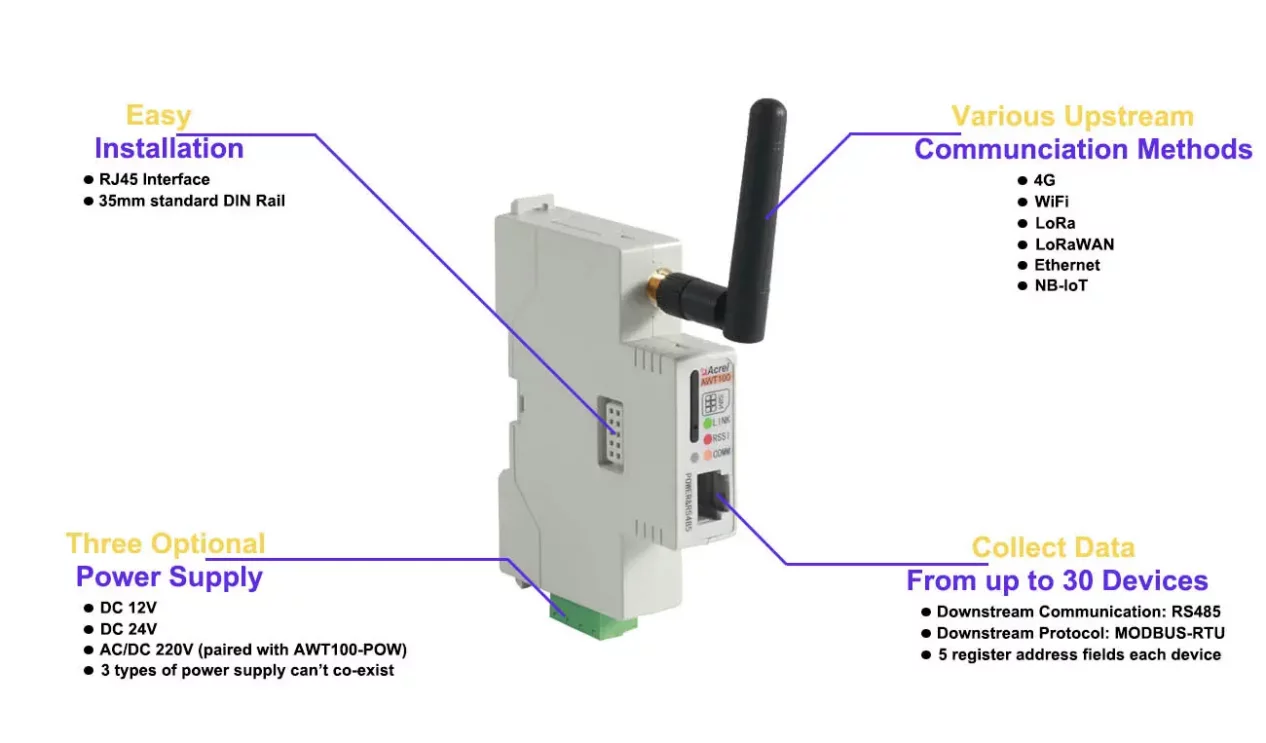 AWT100 converter communication terminal is a new wireless data acquisition device launched by Acrel. The uplink communication includes 2G, 4G, NB, LoRa, LoRaWAN and other communication modes. The downlink interface provides a standard RS485 data interface, which can easily connect power meters and RTUs, PLC, industrial computers and other equipment, only need to complete the initial configuration, you can complete the data acquisition of MODBUS equipment; at the same time AWT100 series wireless communication terminal uses a powerful micro-processing chip, with built-in watchdog technology, reliable performance stable.